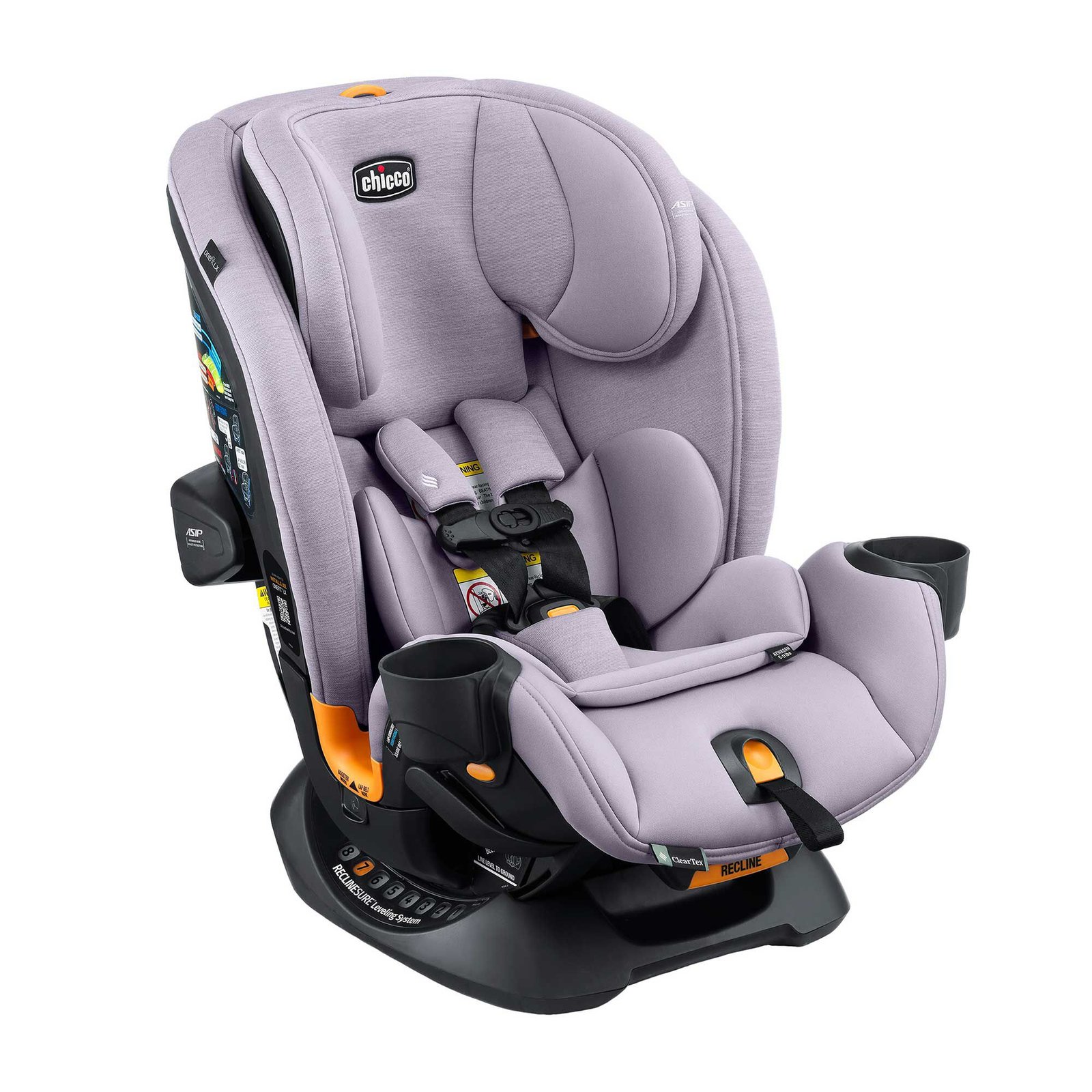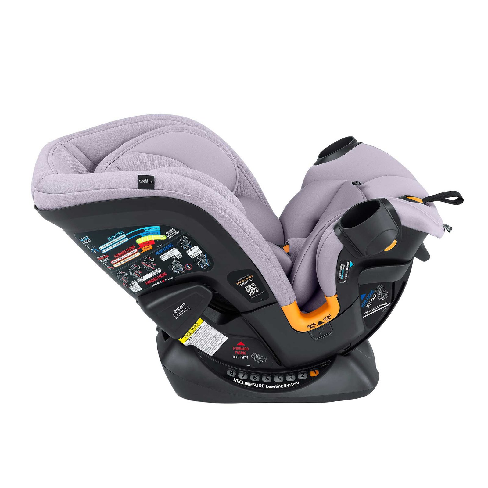 The OneFit™ LX ClearTex® All-in-One Car Seat fits your child, vehicle and life – from birth through booster. OneFit™ LX now features the Chicco-exclusive Self-Tensioning Lock System for forward-facing installation. LeverLock® provides a secure, stable forward-facing vehicle seat belt install with minimal effort. OneFit™ LX easily transitions from a rear-facing harness (5–40 lbs) to forward-facing harness (26.5–65 lbs) to booster (40–100 lbs) as your child grows. Its slim, space-saving design fits easily into your vehicle without compromising comfort for your growing child.